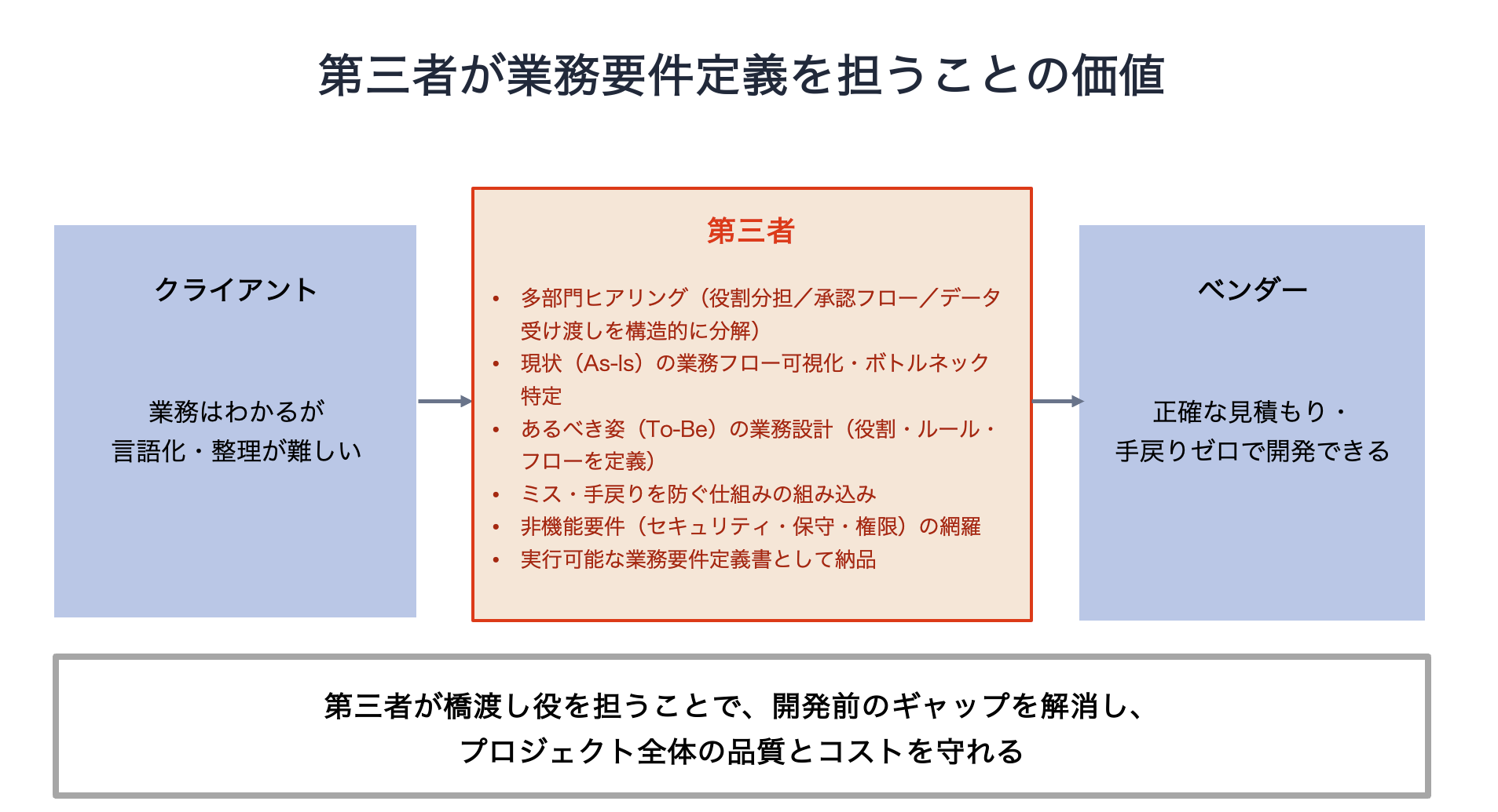 ベンダーはシステムを構築することのプロです。一方で、クライアント企業の業務フローや、部署ごとの役割・情報の流れ・縦割りの実態まで深く把握することは、本来の専門領域ではありません。