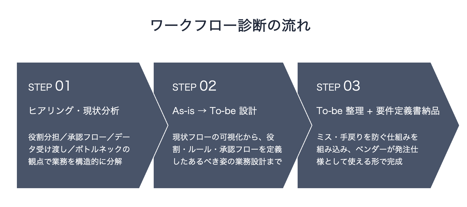 そのうえで、あるべき姿(To-Be)を具体的に設計します。「改善の方向性を示す」にとどまらず、誰が何をいつ承認するか・どのルールで管理するか・どこでミスが起きやすくどう防ぐか——といった実行レベルの業務設計まで落とし込みます。最終的にはベンダーへの発注仕様として使える業務要件定義書として納品します。