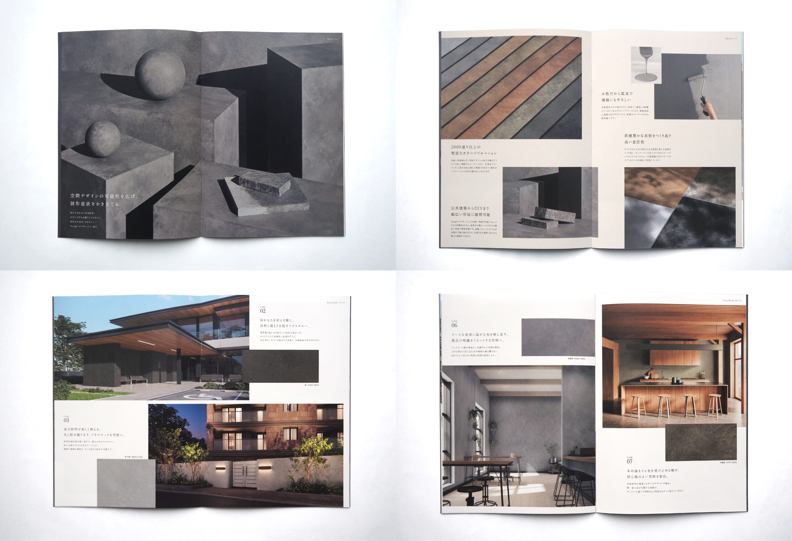 施工事例がないという立ち上げ期ならではの課題に対しては、3DCGによる空間提案ビジュアルを制作し、Texageが実空間の中でどう映えるのかを具体的に伝える構成を設計しました。 さらに撮影では、壁面だけでなく異素材のパネルや球体にも実際に塗装を行い、「高意匠でありながら様々な素材に塗れる」「曲面や凹凸にも塗れる」という製品特長をワンビジュアルで表現。加えて、製品塗料を使ったマーブリング撮影も実施し、Texageならではの表情の豊かさを印象的に可視化しました。